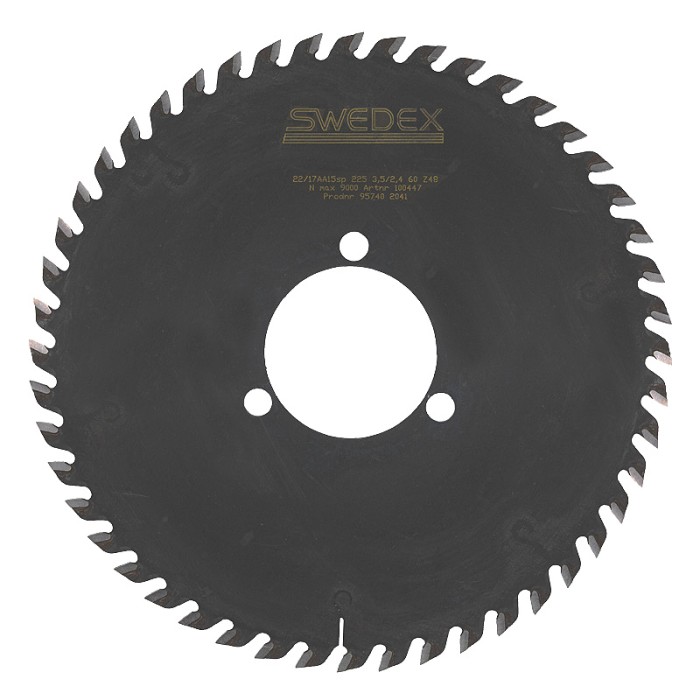 A splitting saw blade for moulders that cuts fast, really fast, and leaves an exceptional planed finish. For best results use with a hydrosleeve. Max cutting speed 100 m/min. These saws have a final heat treatment which leaves a dark oxide "furnace" finish to the blade.
