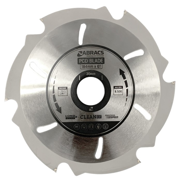 Polycrystalline diamond (PCD) saw blades designed for effortless cutting of fibre cement boards, MDF, GRP, composite decking and other specialist materials. Significantly longer life than traditional TCT blades, with faster, cleaner and more accurate cutting. Larger gullet design reduces dust exposure for user safety. Thin kerf improves cutting speeds and accuracy and reduces material waste. Laser cut blade includes cooling slots and precision ground cutting tips.